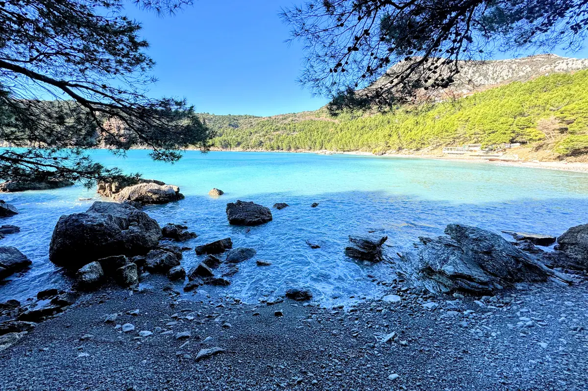 Strbina Beach near Sutomore, surrounded by pine trees, scenic cliffs, and turquoise waters of the Adriatic